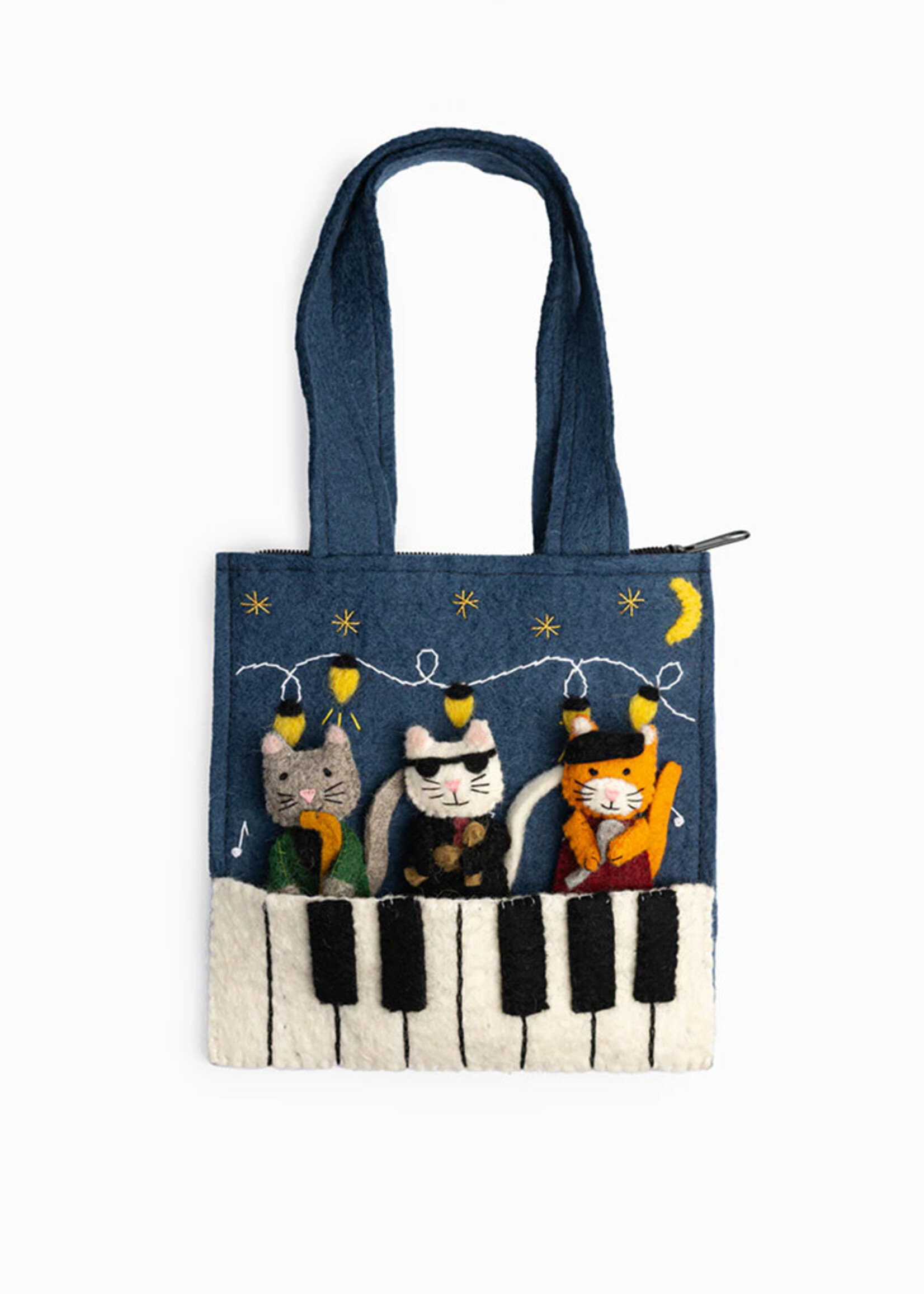 A trio of cool cats is ready to entertain! This jazz club felt puppet bag features three playful felines performers, keeping little hands engaged. With a zip pouch and soft handles, it's perfect for carrying snacks and small treasures on the go.