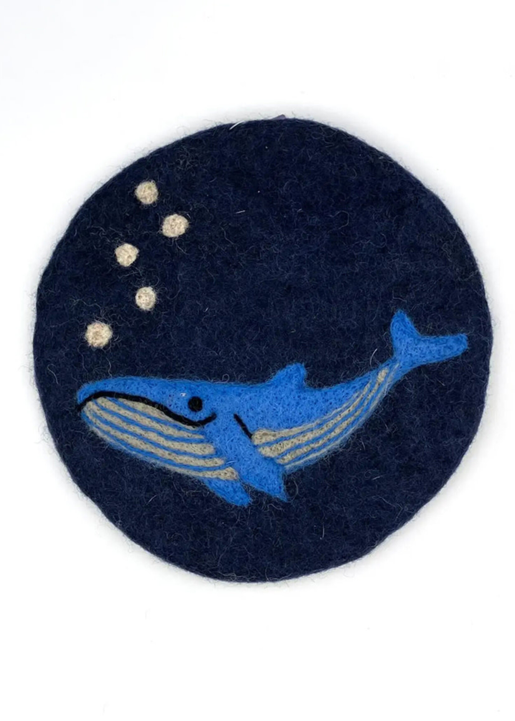 Support fair trade while bringing a nature-inspired accent to your home with this handcrafted round felt trivet from Nepal. This delightful ocean theme trivet features a blue whale with bubbles. Made from wool, this trivet is functional and decorative.